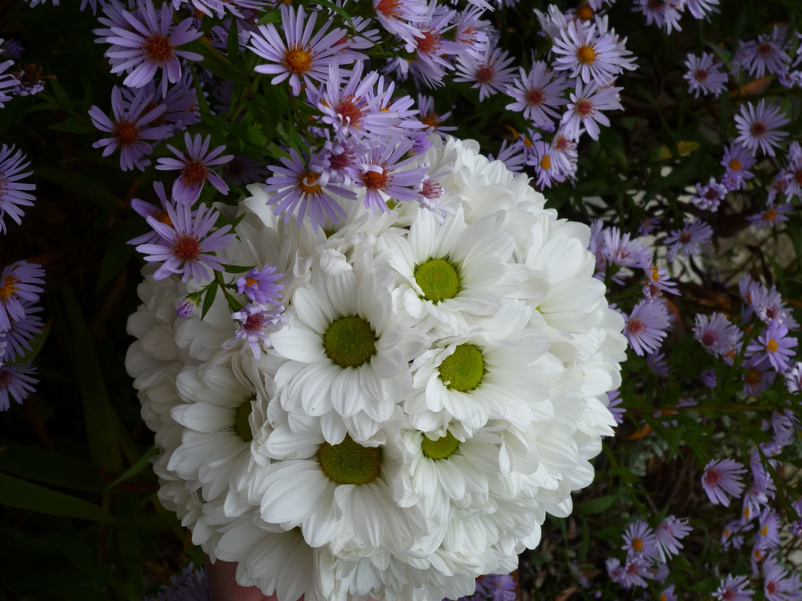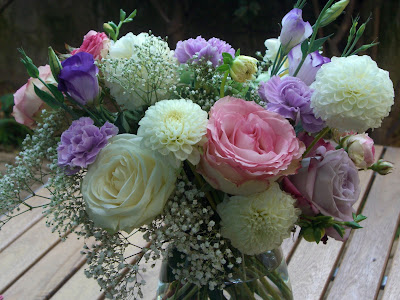 J'ai pris des Bony blancs,de la camomille, du gypsophile et quelques feuilles de lierre du jardin.